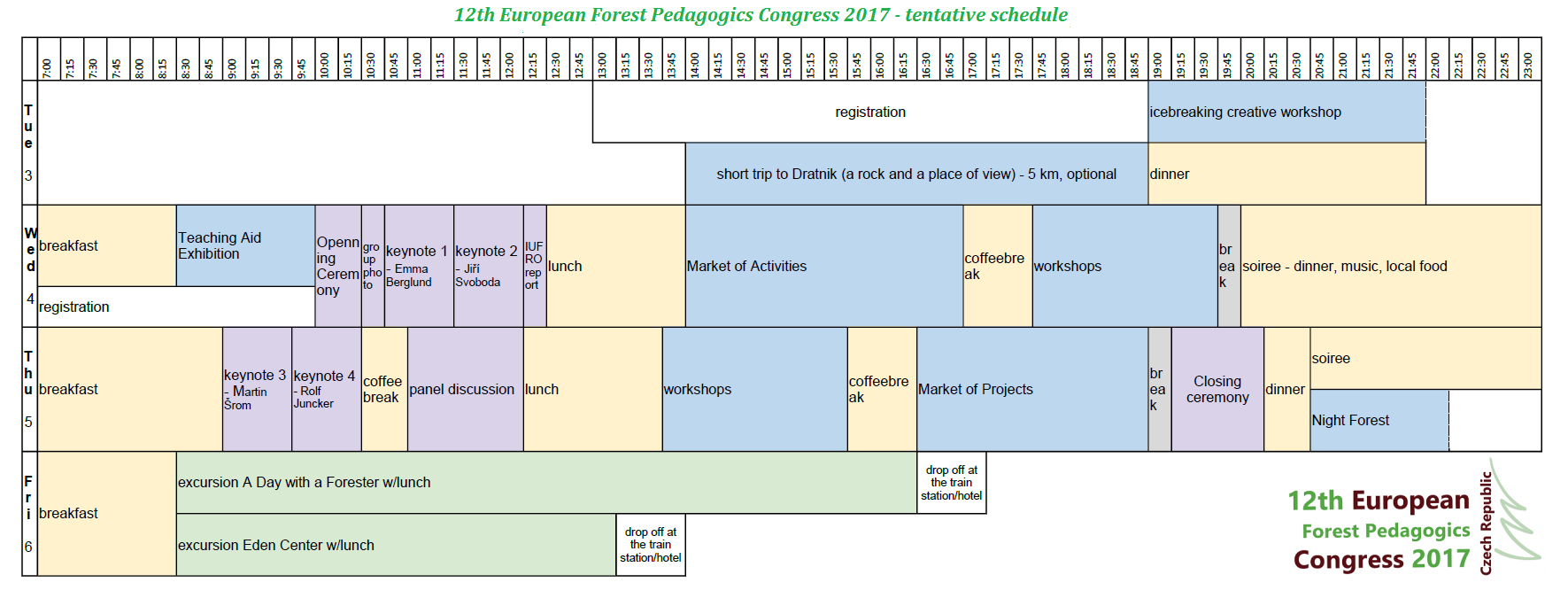Participants will choose one of several workshops. Each workshop lasts 2 hours. The signing up for workshops will be opened several days after the registration deadline. Choice will be also possible in the beginning of the Congress. Shortlist of workshops will be available online at www.lesnipedagogika.cz/FPcongress