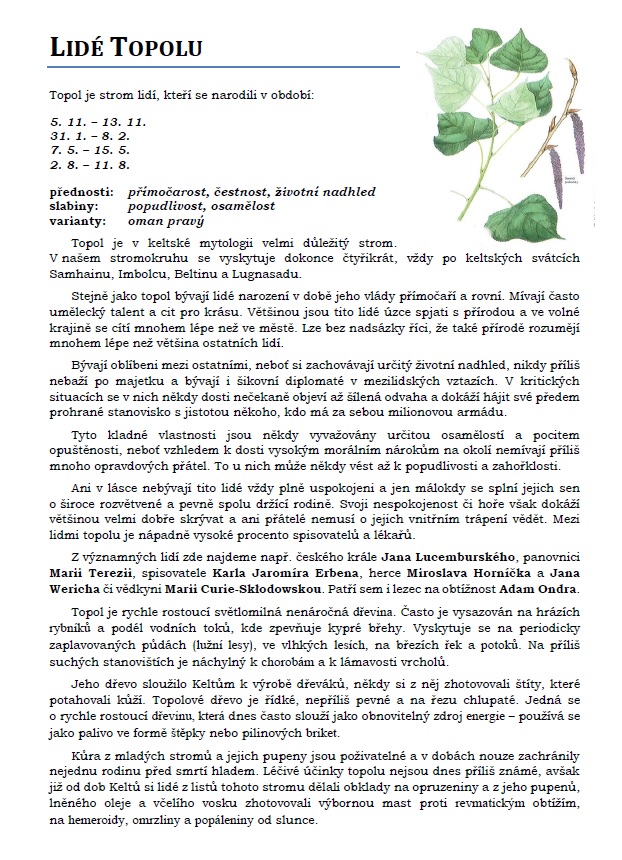 Jakmile se člověk narodí, stává se s prvním nadechnutím zrozencem určitého znamení zvěrokruhu. Víme však, že do světa vstupujeme nejen například jako Býci, Kozorozi či Lvi, ale i jako Olše, Jasany, Borovice a jiné stromy. Podle data našeho narození je nám totiž přisouzen i určitý druh stromu.
