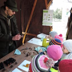 Děti poznávaly přírodniny pomocí hmatu a vyrobily si dřevěné medaile. I přes nepříznivou předpověď počasí přišlo přibližně 120 dětí, převládaly spíše ty školkové.